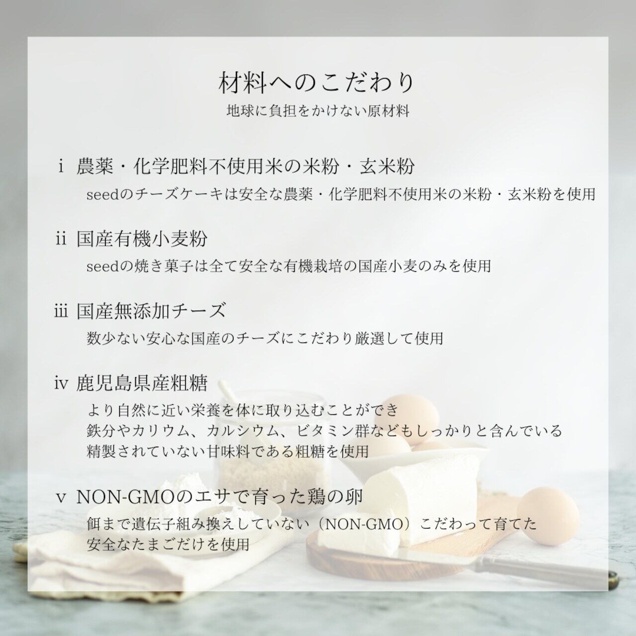 なめらかな特製チーズクリーム、ザクザク食感のクランブルクッキー、農薬・化学肥料不使用米の玄米粉でつくるスポンジ。